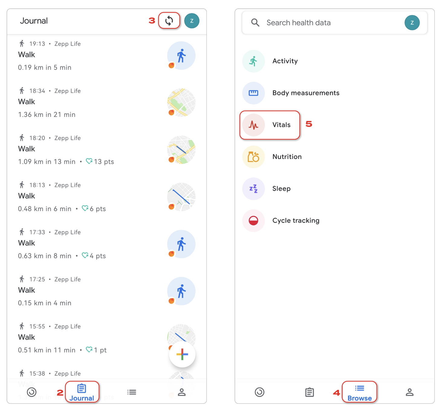 2. On the "Journal" page, click on the two arrows icon next to your Profile picture to initiate the sync with Zepp data. The sync is completed when you see the "Zepp Life” icon next to your workout data in Google Fit.